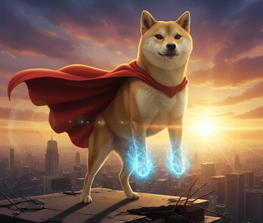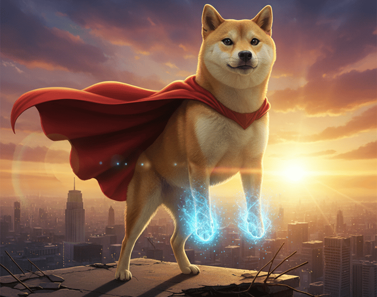 SEO Description: "Epic Shiba Inu doge superhero with glowing powers and red cape on city rooftop at sunset"